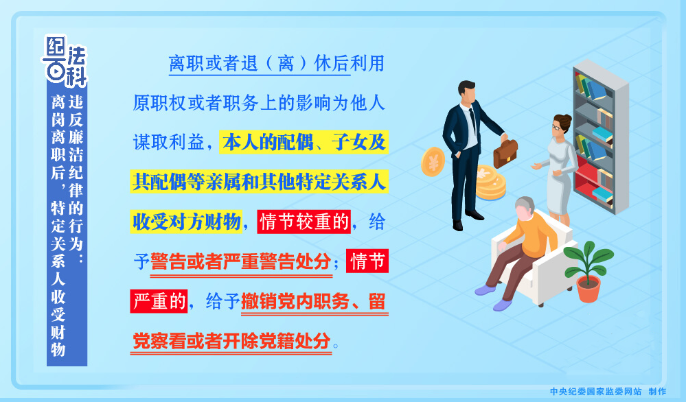 《中国共产党纪律处分条例》第一百零六条第二款规定,离职或者退(离)休后利用原职权或者职务上的影响为他人谋取利益,本人的配偶、子女及其配偶等亲属和其他特定关系人收受对方财物,情节较重的,给予警告或者严重警告处分;情节严重的,给予撤销党内职务、留党察看或者开除党籍处分。